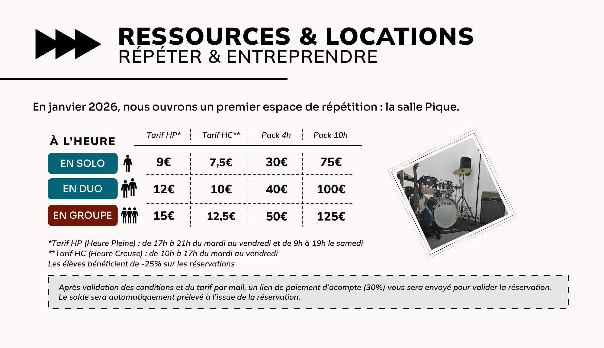 Pupitres, accessoires, instruments : n’hésitez pas à demander lors de votre réservation